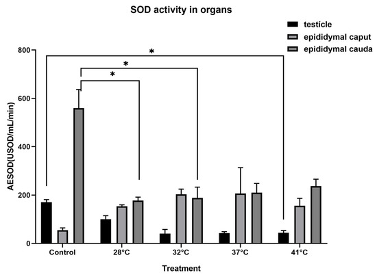 Superoxide Dismutase (SOD) determination is expressed as specific activity (USOD = amount of the enzyme that inhibits 50% of formazan) in the testicle (black bars) and epididymis (caput: light grey bar; cauda: dark grey bar) of H. propinqua. Bars represent averages ± SE. Asterisks denote significant differences when the same organ is compared between treatments (ANOVA, Tukey–Kramer post hoc test, p < 0.05). n = 5 organisms by treatment.