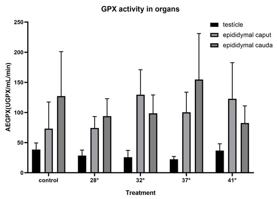 Glutathione Peroxidase (GPX) determination is expressed as specific activity (expressed as UGPX [nmol NADPH oxidized per min]) in the testicle and epididymis of H. propinqua subjected to different temperatures. n = 5 organisms by treatment.