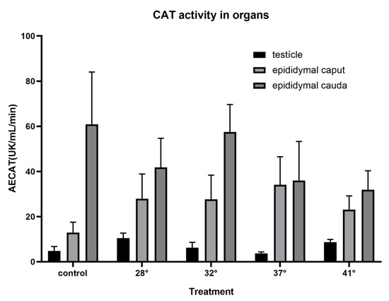 The specific SOD activity determined in the testis of H. propinqua at a temperature of 28° and up to 37 °C showed no differences. However, SOD activity in the 41 °C treatment compared to the control group (p = 0.0534) decreased by ~75% (Figure 3). In the epididymis, SOD activity decreased in the 28 and 32 °C treatments at the level of the epididymal cauda (F = 1.250, p = 0.3382; F = 3.894, p = 0.0215, respectively), compared to the caudal region of the control group (Figure 3). It can be seen in Figure 4 that there are no significant differences when comparing GPX activity in the testis (F = 0.5336, p = 0.7127) and the different regions of the epididymis (caput, p = 0.625; cauda, F = 0.3097, p = 0.8681) between treatments. Likewise, no significant differences were found in testicular or epididymal CAT activity in the various treatments to which the organisms were subjected (testis, F = 0.7122, p = 0.5932; caput, p = 0.6296; cauda, p = 0.7396) (Figure 5).