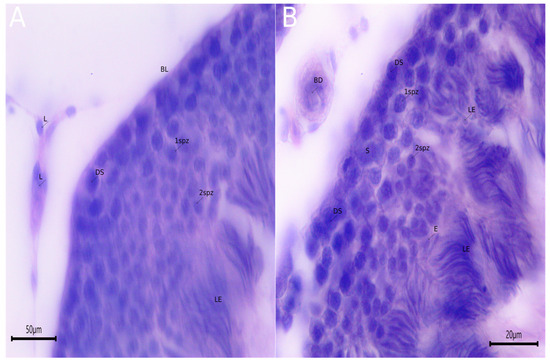 Micrographs of testis of H. propinqua. (A) Leydig cells (L); basal lamina (BL); dark spermatogonia (DS); primary spermatocytes (1spz); secondary spermatocytes (2spz); and elongated spermatids (LE). (B) Sertoli cell (S); blood vessels (BD); spermatids (E). Hematoxylin–eosin (5 µm), 400×.