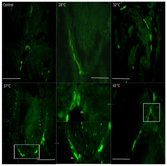 TRPV1 immunolocalization in the testicular interstitium of H. propinqua in the different treatments. TRPV1 increases after 28 °C; in the 32 and 37 °C treatments, it is observed in Leydig cells. A) Leydig cells (L); basal lamina (BL). The arrows point to what is indicated by the white box at each temperature. Fluorescence microscopy 400×. Bar = 100 μm.
