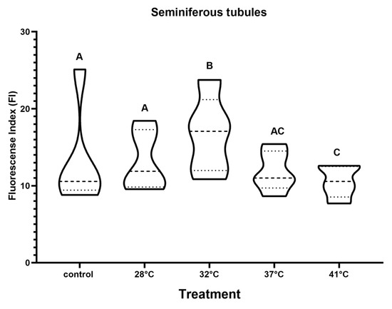 TRPV1 expression in the seminiferous tubules of H. propinqua expressed as fluorescence index (FI) in the different treatments. Different letters represent significant differences between treatments (ANOVA, Tukey–Kramer post hoc test, p < 0.05). n = 5 organisms by treatment.