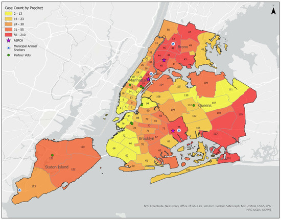 Over the 9-year study period, cases were received from all 77 precincts and 9 Housing Police Service Areas (PSAs) within the five New York City area boroughs. Figure 1 displays the geographic distribution of cases by borough and precinct. At the precinct level, more cases were received from precincts with higher populations and those proximate to ASPCA locations, municipal animal shelters, or partner hospitals (partner hospitals are those that have agreed to receive animals from law enforcement officers on behalf of the ASPCA).