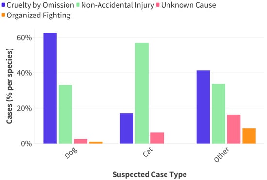 There was a relationship between species and suspected case type, with the more common suspected case type for cats being non-accidental injury, while for dogs and other species it was neglect, hoarding, or abandonment. (Figure 3.)