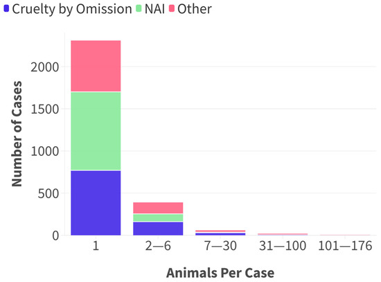The median case size was one animal, with 2310/2783 (83%) cases relating to one animal (skewness = 14.23; range 1–176). (see Figure 4). Animal fighting and hoarding typically included more animals per case (Table 3 diff = −15.7432, p = 0.001). The suspected hoarding cases related predominantly to cats (19), dogs (4), and rabbits (1); other animals found on site included birds, fish, hamsters, and guinea pigs.