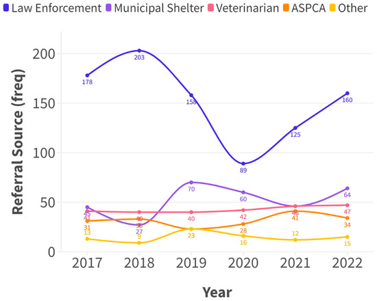 Cases were most commonly referred via law enforcement officers, including those received from the public via 311/911 or direct report to an officer (1018/2783, 37%), followed by municipal shelters (383/2783, 14%), non-ASPCA veterinarians (311/2783, 11%), and ASPCA staff (220/2783 8%). Referral source data were not captured in cases initiated before 2017, contributing to an overall 759/2783 (27%) cases with an unknown referrer. The proportion of cases received from different referral sources between 2017 and 2022 is shown in Figure 5.