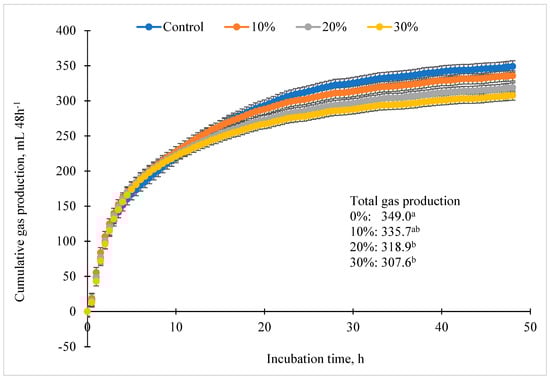 A set of in vitro incubations was conducted to determine the effect of different levels of MB (0%, 10%, 20%, and 30% as-fed) in a beef feedlot ration diet on rumen pH, in vitro gas production, CH4 emission, and IVDMD when diets were incubated with rumen fluid for 48 h. For in vitro incubations, 2.5 g of feedlot ration diets (% as-fed; Table 1) was placed in 250 mL ANKOM (ANKOM Technology Corp., Macedon, NY, USA) sample bottles containing 40 mL of pooled ruminal fluid (pH 5.61) and 160 mL of artificial saliva (pH 6.8) [23]. Each incubation was performed in five replications. The bottle was flushed with CO2 gas before being capped with an ANKOM Gas Production module. One-liter FlexFoil PLUS sample bags (SKC Inc., Eighty-Four, PA, USA) were connected to the modules. Bottles were placed in a shaking incubator at 39 °C; the bottles containing only inoculum and buffer served as blanks. Cumulative ruminal gas production was recorded every 30 min for 48 h via the ANKOM system, which records pressure buildup in individual vessels. The remaining contents of the sample bottle were used for estimating the IVDMD: bottle contents were poured into pre-weighed 250 mL beakers, dried in a forced-air oven at 60 °C for approximately 48 h, and then weighed. After incubating for 48 h, two 6.0 mL samples of collected gas were taken from each sample bag for GHG and other gas analyses. Gas sample bags were closed and separated from the module. Then, GHG (CH4) concentration was determined using an SRI gas chromatograph equipped with a mechanized electron capture detector (ECD) and flame ionization detector (FID) (SRI Instruments, Torrance, CA, USA). Analyzers were calibrated with certified calibration gasses (www.ctigas.com sales@ctigas.com; 920 N Tradewinds Pkwy, Columbia, MO, USA). Specific gas concentrations were plotted against total gas production to estimate total gas emission per hour or gas produced on a DM basis.