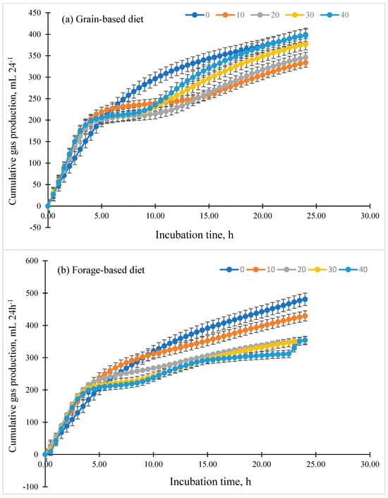 The effect of different levels of US malted barley (MB; 0%, 10%, 20%, 30%, and 40% MB, DM basis) and basal diets (grain-based (a) vs. forage-based (b) diets) on cumulative in vitro gas production when incubated with pooled rumen fluid (from 3 cannulated steers) for 24h (n = 3) in a dairy ration (Exp. 2a).