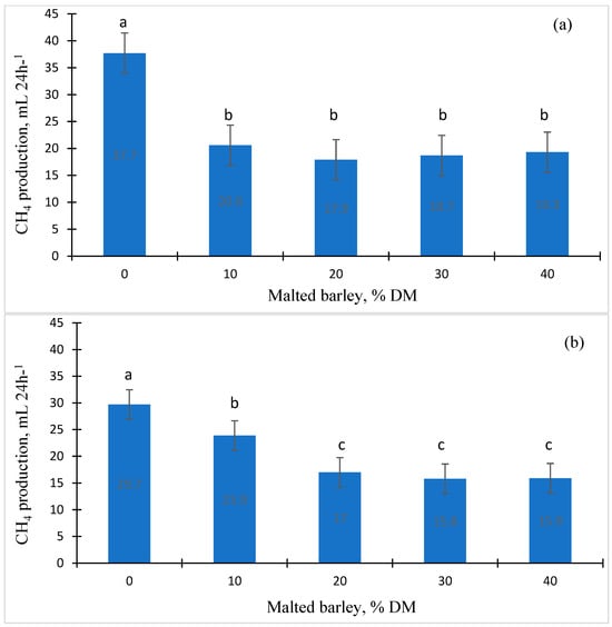 The effect of different levels of US malted barley (MB; 0%, 10%, 20%, 30%, and 40% MB, DM basis) and basal diets (grain-based (a) vs. forage-based (b) diets) on methane (CH4) production when incubated with pooled rumen fluid (n = 3) for 24 h (n = 6) in a dairy ration (Exp. 2a). a–c Superscript letters significantly differ (p < 0.05).