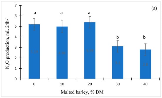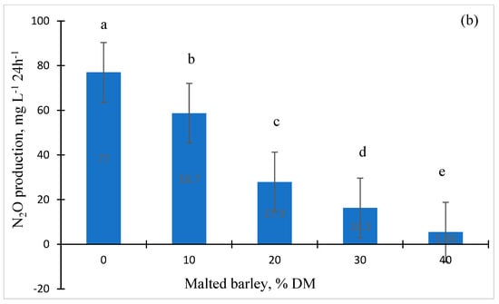 The effect of different levels of US malted barley (MB; 0%, 10%, 20%, 30%, and 40% MB, DM basis) and basal diets (grain-based (a) vs. forage-based (b) diets) on nitrous oxide (N2O) production when incubated with pooled rumen fluid (n = 3) for 24 h (n = 3) in a dairy ration (Exp. 2a). a, b, c, d, and e Superscript letters are significantly differed (p < 0.05).