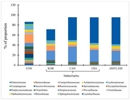 Family-level classification of the bacterial community composition in malted barley (MB) supplementation with relative abundance > 1.0%) in a dairy ration (Exp. 2b). CON = control; KOR = Korean MB; CAN = Canadian MB; USA = American MB; Amylase = alpha-amylase (E.C. 3.2.1.1) added at 0.2 g 100 mL−1.