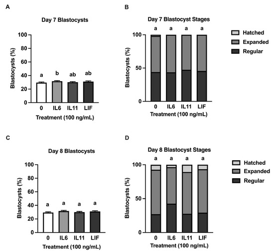 Embryo cleavage was assessed 2 d post-fertilization. It averaged 83.86 ± 1.93% (range: 77 to 89%). All blastocyst data are presented based on cleaved embryo numbers. The cytokine supplementation scheme spanned from d 5 to 8 post fertilization to parallel previous IL6 supplementation work completed by the lab [25,26,31,32,33,34,35]. Supplementing IL6 increased (p = 0.04) d 7 blastocyst formation compared to controls but not blastocyst formation at d 8 (Figure 1A,C). No effects of IL11 and LIF were detected on d 7 or 8 for blastocyst formation. None of the treatments influenced the proportion of regular and advanced blastocysts at d 7 or d 8 (Figure 1B,D). All blastocyst development data are presented relative to the number of cleaved embryos.