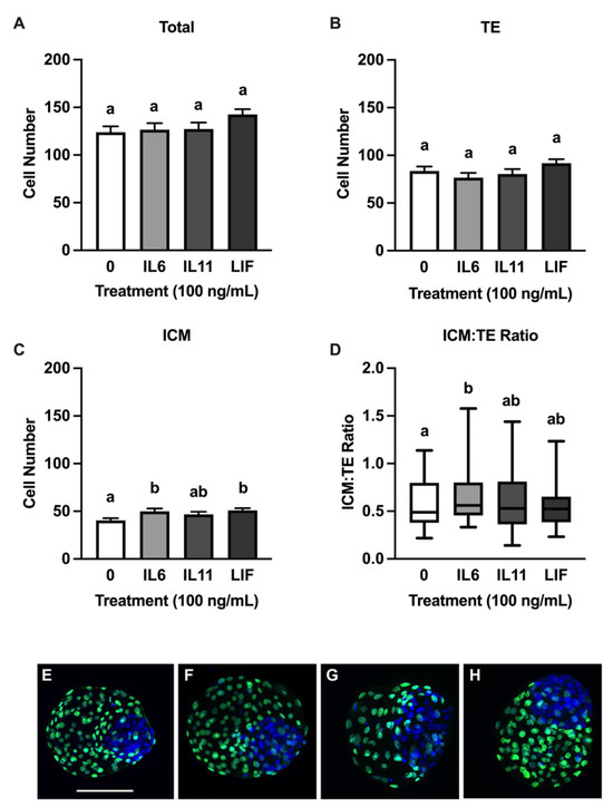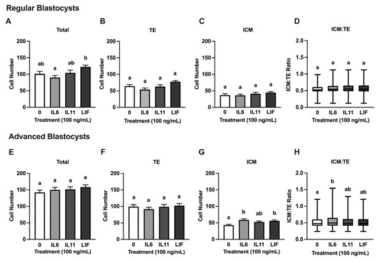 Treatment with IL6 and LIF influence cell composition in regular and advanced blastocysts. Embryos were treated with 100 ng/mL of either IL6, IL11, or LIF from d 5–8 post fertilization. On d 8, regular (n = 15–17 blastocysts/treatment over 6 replicates) and advanced (expanded and hatching) (n = 17–23 blastocysts/treatment over 6 replicates) blastocysts were fixed and processed for immunofluorescence and quantification of inner cell mass (ICM) and trophectoderm (TE) cells. Shown are total number of cells in regular blastocysts (A), total number of TE cells in regular blastocysts (B), total number of ICM cells in regular blastocysts (C), ICM/TE ratio in regular blastocysts (D), total number of cells in advanced blastocysts (E), total number of TE cells in advanced blastocysts (F), total number of ICM cells in advanced blastocysts (G), and ICM/TE ratio in advanced blastocysts (H). Different letters indicate statistical differences (p ≤ 0.05). (A–C,E–G) show means and standard error of the means (SEM). (D,H) show the median ICM/TE ratio with first quartile boxes from all datelines.