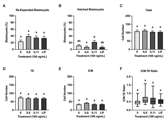 Human recombinant IL6, IL11, and LIF supplementation did not improve IVP embryo cryotolerance. Embryos were treated with either 0 (control), or 100 ng/mL IL6, IL11, or LIF from d 5–8 post fertilization. On d 8, a subset of blastocysts was slow frozen and thawed for 24 h (n = 74–97 blastocysts/treatment over 6 replicates). Re-expanded and hatched blastocysts were processed for immunofluorescence and quantification of the inner cell mass (ICM) and trophectoderm (TE) cells (n = 25–39 embryos/treatment over 6 replicates). Shown are the blastocyst re-expansion after cryopreservation and thawing (A), blastocyst hatching after cryopreservation and thawing (B), total cell number of sampled frozen and thawed blastocysts (C), trophectoderm (TE) cells of sampled frozen and thawed blastocysts (D), ICM cells of sampled frozen and thawed blastocysts (E), and ICM/TE ratio of sampled frozen and thawed blastocysts (F). Different letters indicate statistical differences (p ≤ 0.05). (A–E) show means and standard error of the means (SEM). (F) shows the median ICM/TE ratio with first quartile boxes from all datelines.