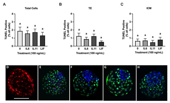 Percentage of TUNEL positive cells after thawing in IL6, IL11, and LIF treated embryos. Embryos were treated 100 ng/mL of either IL6, IL11, or LIF from d 5–8 post fertilization. A subset of blastocysts was slow frozen and thawed for 24 h. Re-expanded and hatched blastocysts were processed for immunofluorescence and quantification of apoptosis (TUNEL) in the inner cell mass (ICM) and trophectoderm (TE) cells (n = 25–39 blastocysts/treatment over 6 replicates). Shown are the percentage of total TUNEL positive cells in frozen and thawed embryos (A), percentage of TUNEL positive TE cells (B), and percentage of TUNEL positive ICM cells (C). (D–H) contain representative images of blastocysts from DNase-treated positive controls, non-treated controls, and the IL6, IL11, and LIF treatments, respectively. Scale bar = 180 μm. (A–C) show means and standard error of the means (SEM). Different letters indicate statistical differences (p ≤ 0.05).