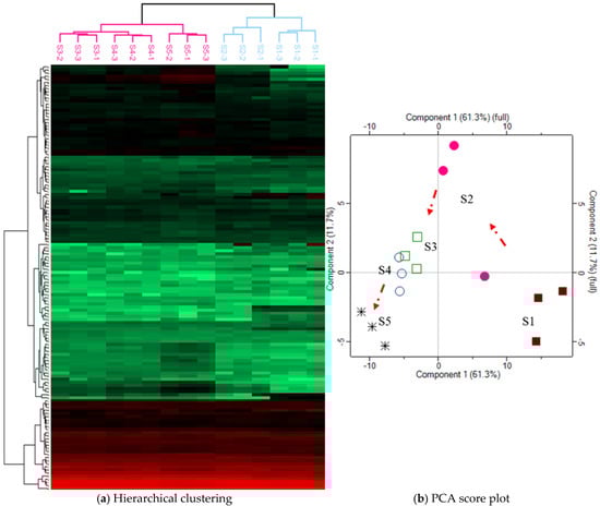 Hierarchical clustering (a), and PCA score plot (b) of differential proteins among the somatic cell count groups. S1 to S5 groups represent somatic cell counts of 6–9, 17–20, 38–42, 68–80, and 176–243 × 10⁴ cells/mL, respectively.