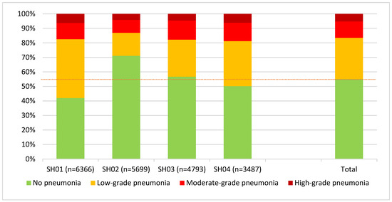 Evaluation of the entire data pool of 20,345 carcasses assessed according to the new scheme showed that 55.1% of the animals had no alterations of the lung. However, in most of the animals with pneumonia, low-grade forms were observed in 28.4%, followed by moderate-grade forms in 11.3%, and the rarest was high-grade pneumonia in 5.2%. Analysis of the data individually for the four different abattoirs showed specific patterns with deviations from the average, particularly in the “No pneumonia” category, where the difference between SH01 and SH02 was 29.1% (42 versus 71.1%), as shown in Figure 1.