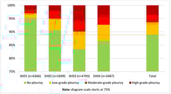 In the case of pleurisy, the analysis of the data set showed that 88.9% of the carcasses examined showed no alterations of the pleura. Here, as with pneumonia, the most frequent changes were low-grade in 4.7%, but in contrast, high-grade pleuritis in 3.7% was more common than the moderate-grade pathology in 2.7%. For the various abattoirs, there were some deviations from the overall value, as shown in Figure 2.