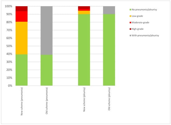 The slightly higher rate of pneumonia under the old scheme may reflect that unhealthy batches of pigs were slaughtered and recorded in the extended time period for data collection more frequently compared to those in the new scheme. Analysis of the subset of carcasses evaluated according to both schemes showed no difference in prevalence. Although the introduction of the low-grade level might be understood as more sensitive in contrast to the old approach, the data from the pigs that were assessed in parallel with the both schemes (Figure 3) showed similar frequencies of recorded pathological changes. This confirms that lungs without alterations are distinguished from those with low-grade alterations using both schemes.