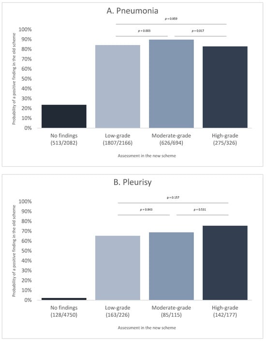 Probability of a positive finding in the old scheme for the different groups as a result of categorization according to the new scheme. (A) Data for pneumonia. (B) Data for pleurisy (in brackets: positive carcasses for the old scheme/carcasses in the category according to the new scheme). The p-values shown in the figures are taken from the respective post hoc test of a model explained in Section 2.3.
