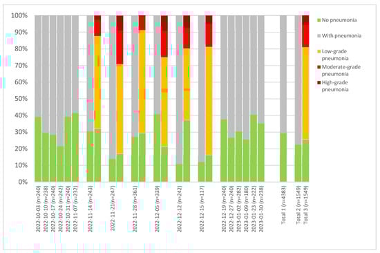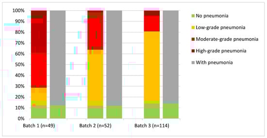 For six batches (Figure 6), data were available for both schemes, whereas for four batches, the percentage of ‘no findings” was similar, and for two batches, a difference in both directions was clear. Furthermore, it becomes clear that high-grade pneumonia occurs to varying degrees in these batches.