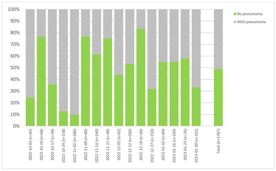 In order to obtain more detailed insight into the patterns, we analyzed two farms delivering a large number of pigs on a regular basis over the extended time period to the same slaughterhouse, each according to the old scheme, broken down by slaughter batch (Figure 6 and Figure 7). Although the batches were delivered on a weekly basis, the health status of the batches was quite heterogenous. It can also be seen that the two farms show strong differences regarding pneumonia findings, with farm 1 (Figure 6) exhibiting average findings of 70.5%, whereas the farm 2 showed 51% (Figure 7). For the latter, very large differences in the health status of the animals are sometimes visible between consecutive batches.