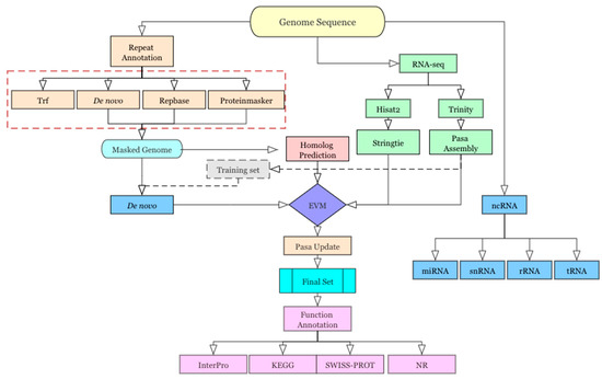 Genome annotation included repeat sequence annotation, gene annotation (including gene structure annotation and gene function annotation), and non-coding RNA (ncRNA) annotation, as shown in Figure 1. A non-redundant reference gene set was generated by merging genes predicted by ab initio prediction, homology-based prediction, and RNA-Seq-assisted prediction.