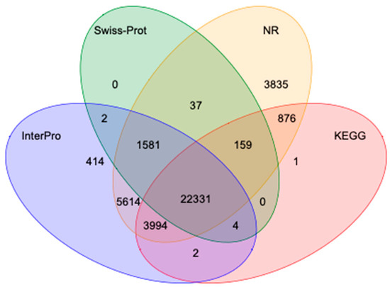 Venn diagram of predicted proteins from Swiss-Prot, non-redundant (NR), InterPro, and KEGG.