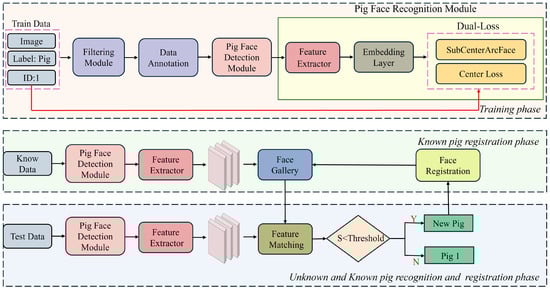Our proposed Pig Face Open-Set Recognition (PFOSR) system operates in three sequential phases to achieve robust and adaptable pig identification: The training Phase, the Known Pig Registration Phase, and the Unknown and Known Pig Recognition and Registration Phase. In the Training Phase, we build and train high-accuracy pig face detection and recognition models on labeled datasets. The detection model isolates pig faces from cluttered scenes, while the recognition model extracts discriminative features for each identified pig. Once both models are trained, the Known Pig Registration Phase constructs and maintains a feature gallery for already recognized pigs. During this stage, embedding vectors for each known pig are extracted using the trained detection–recognition pipeline and stored in a dynamic repository, allowing new reference data to be incorporated without requiring model retraining. Finally, in the Unknown and Known Pig Recognition and Registration Phase, incoming pig images are passed through the same detection–recognition process and matched against the gallery. If a pig’s features are not found in the gallery, the system automatically assigns a new identity and updates the repository to accommodate the newly encountered animal. This pipeline ensures continuous, real-time pig identification under Open-Set conditions. Figure 2 illustrates the overall architecture. This three-stage pipeline provides a comprehensive solution for pig identification and management, enabling effective livestock monitoring and adapting to changes in the pig population. By adopting this robust method for the advanced detection, recognition, and registration process of pigs, the system lays a reliable foundation for future deployment in farm environments.