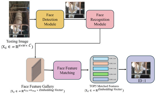 During inference time, our pig face detection and recognition models automatically detect pig faces and extract their feature vectors. In the Pig Face Feature Matching module, the extracted features are compared with those in the Pig Face Feature Gallery using the distance similarity algorithm. The ID corresponding to the feature with the highest similarity score is assigned to the test sample. This enables accurate recognition and seamless registration of new pigs, enhancing operational efficiency and animal welfare by facilitating accurate and non-invasive monitoring of individual pigs.