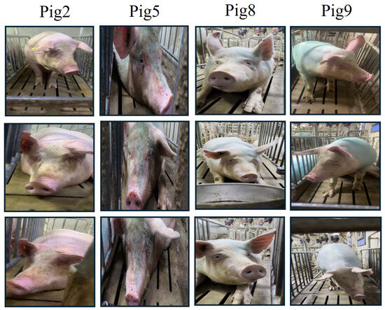 One significant challenge is the collection of pig face data. Pigs often spend considerable time lying down, making it difficult for cameras to capture clear images of their faces. This behavior necessitates sifting through large volumes of data to extract useful pig face images, which is both time-consuming and labor-intensive [11]. Furthermore, pig face data is affected by several factors that complicate recognition tasks. Pigs have highly similar facial features, leading to high intra-class similarity, which makes it difficult for models to distinguish between individuals. Variations in lighting conditions, complex backgrounds within pig pens, and unrestricted movement lead to significant differences in captured images. The pig’s movements significantly affect the distance between its face and the camera, resulting in noticeable inconsistencies in the size and resolution of pig face images. Pigs often have dirty faces due to their living habits, with mud or debris covering parts of their faces. This introduces occlusions and additional variability, even among images of the same individual, making feature extraction and recognition more challenging.