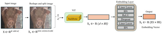 Pig Face Recognition Module in our proposed PFOSR System. This figure illustrates the pig face recognition pipeline in our PFOSR system. The input image is resized to 224 × 224 and processed through a ViT-based backbone for feature extraction. The extracted features are refined through an embedding layer consisting of linear layers, batch normalization (BN), ReLU activation, and dropout, producing the final embedding vector. BS (Batch Size) represents the number of images processed at once, while ES (Embedding Size) refers to the dimensionality of the output feature vector.