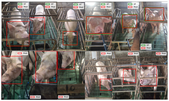 As presented in Table 1, YOLOv8 outperformed its counterparts across all evaluated metrics. It achieved the highest average precisions at IoU thresholds of 0.50 ( = 0.990), 0.75 ( = 0.972), and an overall ( = 0.869). Additionally, it attained the highest recall rate of 0.895. These results indicate that YOLOv8 possesses a superior ability to accurately detect pig faces, even under challenging conditions such as varying lighting and occlusions.