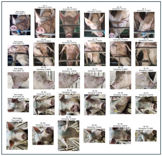 To further demonstrate the efficacy of our ViT-DL-IN21K model in Closed-Set recognition, we present a visual analysis of its performance on the expanded test set comprising 65 pig faces (56 known and 9 previously unknown classes that have been successfully registered). Figure 8. illustrates several test images alongside their true identities and the top five most similar matches retrieved from the Pig Face Gallery. Each retrieved image is accompanied by its cosine similarity score and corresponding true ID. In the first column of Figure 8, the test image is accurately matched with gallery images that share the same true ID, evidenced by high similarity scores ranging from 0.85 to 0.96. This consistent matching across different test samples highlights the model’s robust discriminative capabilities, ensuring that each known class is correctly identified and associated with the gallery database. The high similarity scores confirm that the feature representations learned by the ViT- DL-IN21k model are both distinctive and reliable, effectively capturing the nuances of each pig face. Moreover, the successful matching of test images from the previously unknown classes, now registered as known, underscores the effectiveness of our registration mechanism. By incorporating these new classes into the gallery, the model seamlessly integrates them into the Closed-Set recognition framework, maintaining high accuracy and minimizing misclassifications. This visualization not only validates the model’s ability to handle dynamic class additions but also reinforces its suitability for real-world applications in intelligent pig farming, where the ability to recognize and adapt to new individuals is crucial.