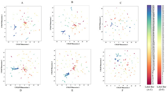 UMAP Visualization of Test Features for Model Performance on Dataset1 and Dataset2 in PFOSR System. This figure presents the UMAP projections of test feature embeddings for three models (ResNet18-DL-IN21K, ResNet50-DL-IN21K, and ViT-DL-IN21K) on two datasets. (A–C) correspond to Dataset1 (Known Pig Face Recognition Dataset test set, 56 known classes), while (D–F) correspond to Dataset2 (65-Known Pig Face Testing Dataset, including 56 known classes and 9 newly registered unknown classes). Each color represents a different pig identity. A more compact and well-separated clustering indicates better feature representation. ViT-DL-IN21K (C,F) shows improved feature clustering, demonstrating its superior ability to distinguish different pig identities, especially in Dataset2, where new classes have been introduced.