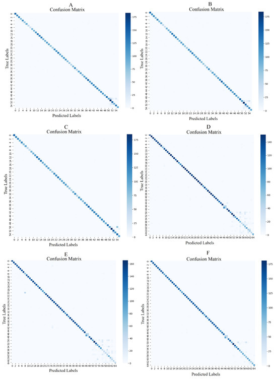 Confusion Matrices for Models Performance on testing Dataset1 and testing Dataset2 in PFCSR System. This figure presents the confusion matrices for three models (ResNet18-DL-IN21K, ResNet50-DL-IN21K, and ViT-DL-IN21K) evaluated on two test datasets. (A–C) correspond to Dataset1 (Known Pig Face Recognition Dataset test set, 56 known classes), while (D–F) correspond to Dataset2 (65-Known Pig Face Testing Dataset, including 56 known classes and 9 newly registered unknown classes). The diagonal elements represent correct classifications, while off-diagonal elements indicate misclassification. Comparing these matrices, ViT-DL-IN21K (C,F) achieves the lowest misclassification rates, as seen by the darker diagonal and lighter off-diagonal cells. This demonstrates its superior performance in both standard Closed-Set recognition (Dataset1) and recognizing newly registered pigs in Dataset2, proving its robustness and adaptability in pig face recognition.