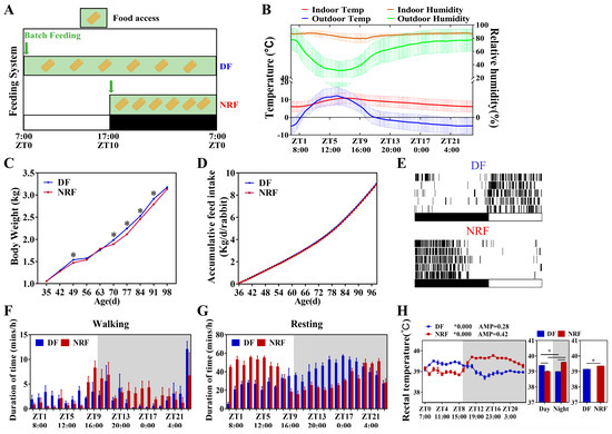 Daytime feeding disturbed the behavioral rhythm and increased weight gain in rabbits. (A), Design of animal feeding regimens. Rabbits subjected to DF were fed at 7:00 a.m. (ZT0) and allowed access to food all day. Rabbits under NRF had access to food from 5:00 p.m. (ZT10) to 7:00 a.m. (ZT0). ZT represents Zeitgeber Time. Green boxes denote periods of food availability. (B), Mean temperature and relative humidity during 24 h in the locations of the open rabbit house. (C), Feeding time changes the circadian rhythm of eating behavior (n = 3 rabbits over five days). (D), Accumulative feed intake (n = 108 per group) under DF and NRF feeding. (E), Average body weight of DF rabbits (n = 108) and NRF rabbits (n = 108). (F,G), Feeding time changes the circadian rhythm of walking and resting behavior. (H), Circadian changes in body temperature curve under DF and NRF feeding conditions (n = 3). The diurnal rhythms were assessed using JTK analysis, ADJ.P represents adjusted minimal p-values, ADJ p < 0.05 indicates a significant effect on circadian rhythm, AMP represents amplitude and LAG represents phase. White and gray areas correspond to objective daytime and nighttime, respectively. Statistical significance was determined using a T-test, * p < 0.05.