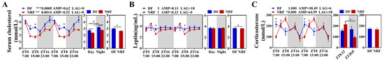 Daytime feeding altered hormonal levels in growing rabbits. (A–C) Diurnal variations in serum concentrations of cholesterol, leptin, and corticosterone in rabbits subjected to DF and NRF (n = 6). The diurnal rhythms were assessed using JTK analysis, ADJ p represents adjusted minimal p-values, * ADJ p < 0.05, indicates a significant effect on circadian rhythm, AMP represents amplitude, and LAG represents phase. White and gray areas correspond to objective daytime and nighttime, respectively. Statistical significance was determined using a T-test, * p < 0.05, ** ADJ p < 0.01, *** ADJ p < 0.001.
