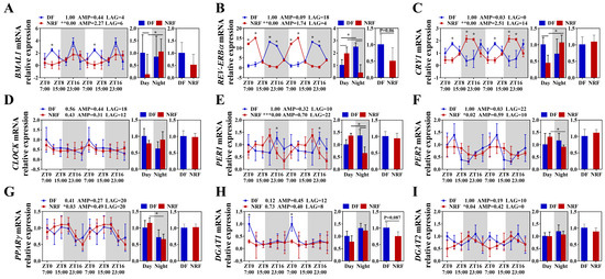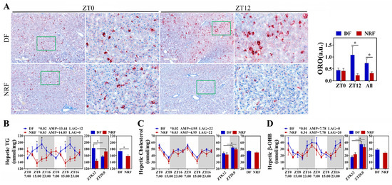 Daytime feeding increased lipid deposition in the liver. (A) Representative images of Oil red O-stained hepatic sections from DF and NRF rabbits (Bar = 400 µm, 100 µm). (B–D) Diurnal variations in hepatic triglyceride, cholesterol, and β-OHB concentrations in DF and NRF groups (n = 6). The diurnal rhythms were assessed using JTK analysis, ADJ p represents adjusted minimal p-values, * ADJ p < 0.05 indicates a significant effect on circadian rhythm, AMP represents amplitude and LAG represents phase. White and gray areas correspond to objective daytime and nighttime, respectively. Statistical significance was determined using a T-test, * p < 0.05.