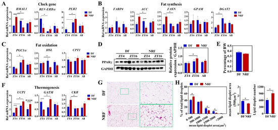 Effects of feeding time on lipid metabolism of BAT. (A–C) Transcript levels of genes associated with clock, fat synthesis, and fat oxidation in BAT from DF and NRF rabbits (n = 6). (D) Representative Western blots of PPARγ protein levels normalized to GAPDH and quantification of bands. (E) BAT weight was measured and normalized to body weight (BW) across the study population (n = 12). (F) Transcript levels of genes related to thermogenesis in BAT from DF and NRF rabbits (n = 6). (G) Representative images (n = 10) of HE-stained sections of BAT from DF and NRF rabbits (Scale bar = 400 µm or 100 µm). (H) Quantization of lipid droplets from (G) (n = 10). Statistical significance was determined using a T-test, * p < 0.05.