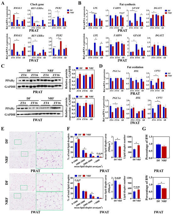 Effects of feeding time on lipid metabolism of PRAT and IWAT. (A,B,D) Transcript levels of genes associated with clock, fat synthesis, and fat oxidation in PRAT and IWAT from DF and NRF rabbits (n = 6). (C) Representative Western blots of PPARγ protein levels normalized to GAPDH and quantification of bands. (E) Representative images (n = 10) of HE-stained sections of PRAT and IWAT from DF and NRF rabbits (Scale bar = 400 µm and 100 µm). (F) Quantification of lipid droplets from (E) (n = 10). (G) PRAT and IWAT weight were measured and normalized to body weight (BW) across the study population (n = 12). Statistical significance was determined using a T-test, * p < 0.05.