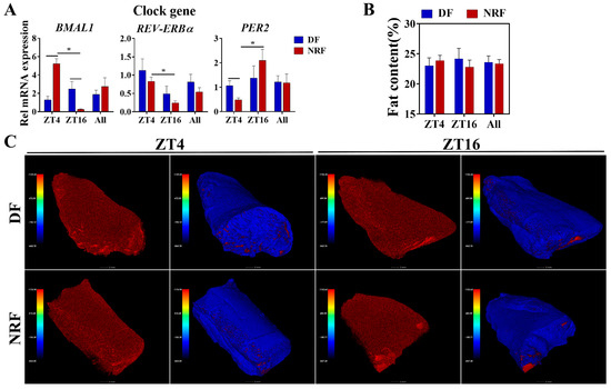 Effects of feeding time on fat content within quadriceps muscles. (A) Transcript levels of genes associated with clock genes in quadriceps muscles from DF and NRF rabbits (n = 6). (B) Quantification of muscle fat content in (C) (n = 12). (C) Representative images (n = 12) of CT scan images of quadriceps muscles from DF and NRF rabbits (Scale bar = 2 mm). Statistical significance was determined using a T-test, * p < 0.05.