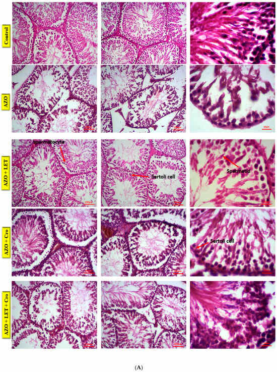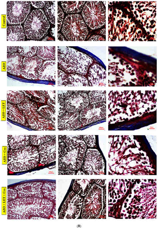 Microscopic images of testicular tissue from male rats in different treatment groups were analyzed using 5 µm sections stained with hematoxylin–eosin (H&E) at ×1000 magnification (A) and Masson’s trichrome stain (B). Control group exhibited normal testicular morphology. “Azo” group (busulfan 10 mg/kg) showed significant histopathological alterations. “Azo + Let”, “Azo + Cro”, and “Azo + Let + Cro” groups displayed combined effects of busulfan with letrozole, crocin, and both drugs, respectively. Masson’s trichrome staining further visualized testicular capsule.