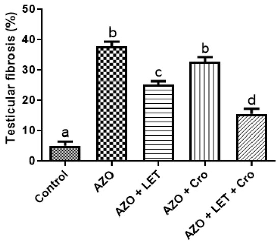 The bar graph illustrates that the azoospermia (AZO) group exhibited significantly higher testicular fibrosis (approximately 37%) compared to the control group (approximately 5%). Letrozole (LET) treatment alone reduced fibrosis to around 26%, while administering crocin (Cro) alone resulted in fibrotic levels of approximately 34%. Notably, the combined treatment of letrozole and crocin (AZO + LET + Cro) led to a substantial reduction in fibrosis, reaching levels of around 15% (Figure 2).