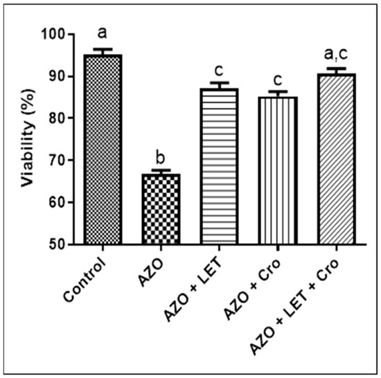 This study presents a comprehensive analysis of the impact of azoospermia on cell viability and sperm motility, highlighting the complexities of male infertility. Azoospermia is characterized by the absence of sperm in the ejaculate and poses significant challenges to male reproductive capabilities, underscoring the need for a deeper understanding of its mechanisms and potential treatments. This study revealed a substantial decline in cell viability in azoospermia conditions compared to the control group, highlighting the urgent need for effective treatment strategies [26]. Notably, the combination of letrozole (LET) and crocin (Cro) partially restored cell viability, suggesting potential synergistic effects. Although the AZO + LET + Cro combination exhibited the highest viability among treatment groups, the differences were not statistically significant, indicating the need for further research to elucidate the specific interactions and the impact of these pharmacological agents (Figure 3).