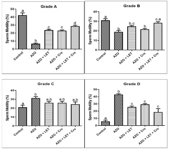 These differences may reflect the inherent variability in the AZO model, indicating residual spermatogenesis or compensatory motility mechanisms in some individuals. The lower motility observed in the treatment groups relative to AZO within these grades could stem from different responses to letrozole and crocin based on the initial sperm quality. The effectiveness of treatments may vary depending on the degree of sperm damage, indicating a nuanced interaction between therapeutic agents and sperm health.