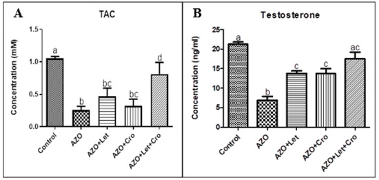 (A) The total antioxidant enzyme activity, (B) Variations in the testosterone hormone levels in different groups. Dissimilar letters denote statistical differences (p < 0.05). The letters (a, b, c, etc.) above the bars represent statistically significant groupings. Bars with the same letter are not significantly different, while bars with dissimilar letters have a statistically significant difference (at the p < 0.05 level, as typically indicated in the figure legend or Materials and Methods Section).