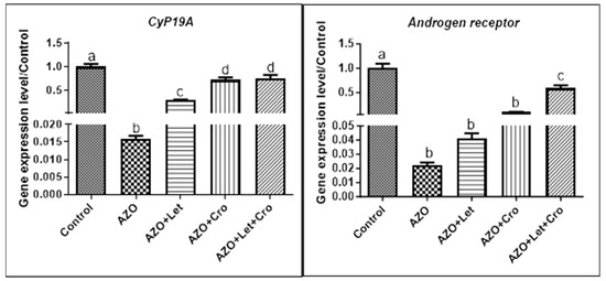 The results obtained from the expression levels of the CYP19A1 genes and Androgen receptor in different groups. Dissimilar letters denote statistical differences (p < 0.05). The letters (a, b, c, etc.) above the bars represent statistically significant groupings. Bars with identical letters are not significantly different, while bars with dissimilar have a statistically significant difference (at the p < 0.05 level, as typically indicated in the figure legend or Materials and Methods Section).