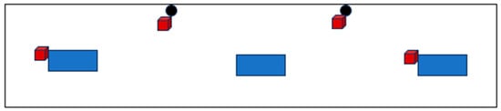 High-Yielding Barn with Block Setup. The above figure is a drawing of the high-yielding pen from an aerial view. Blue blocks represent water troughs. Black circles represent cement posts positioned on the back wall of the barn. The red blocks indicate the location of the salt licks. The blocks were labelled 1–4 corresponding with the blocks, respectively, from left to right. This setup was relevant to weeks 1, 2, and 4.
