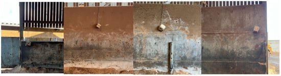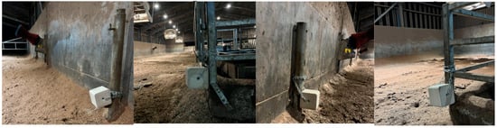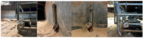 Maxcare minerals (Trouw Nutrition GB, Ashborne, UK) for cattle in 10 kg blocks (n = 4) were installed in the high-yielding cattle yard as seen in Figure 1. The blocks were secured with individual 2 m lengths of short link chain 5 mm in diameter and carabiner clips. For week 1, the mineral blocks were installed 30 cm from the ground in a low non-moveable (LNM) position, as in Figure 2. These mineral licks were removed for a two-day period at the end of week 1 (on day 4) and weighed. This rest period served to mimic the novelty factor in cow interactions with the lick upon each new block placement in subsequent weeks.